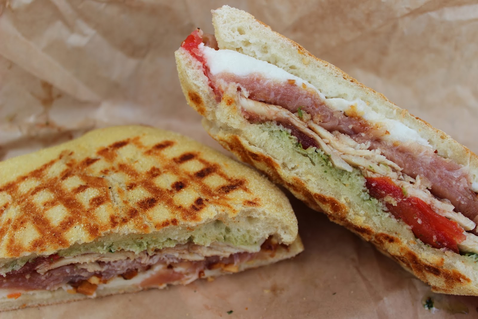 I always get the same thing, the Prosciutto and Chicken Sandwich: fresh prosciutto, tomato, chicken, candied almonds, fresh mozzarella, basil pesto and vinegar, all pressed on ciabatta bread into a panini!